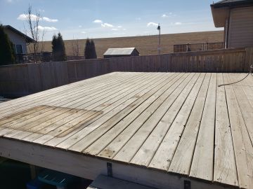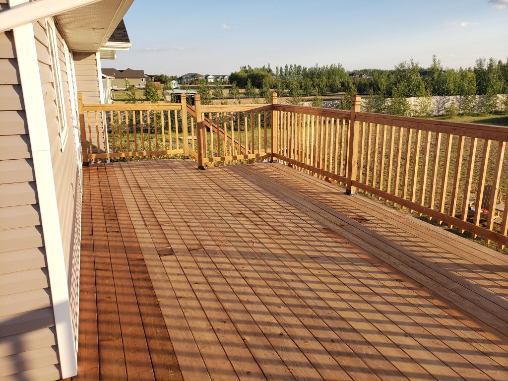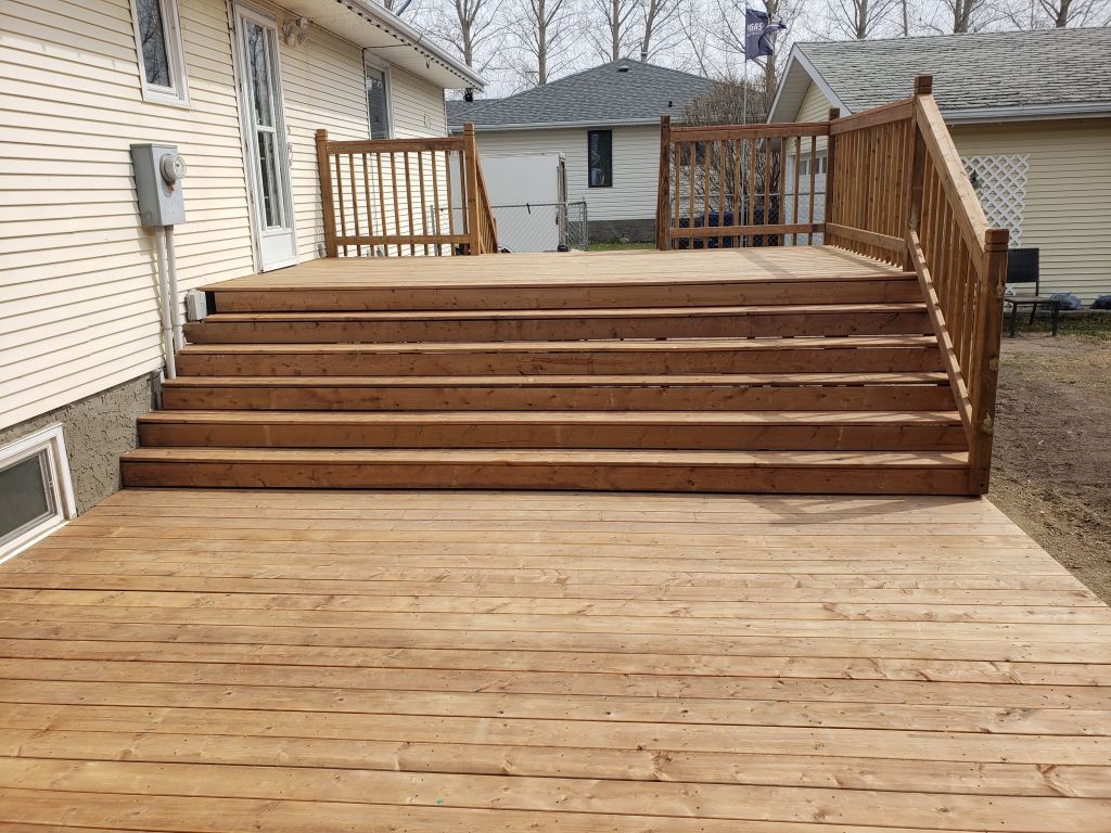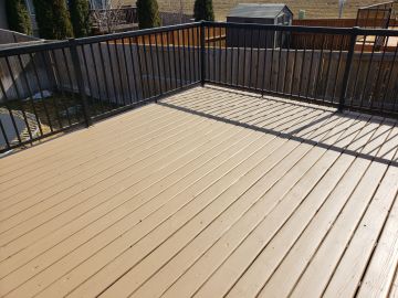 This deck is about 12 years old in need of refreshing, first we took down all railings to prep for sanding, sanded down all boards including stairs, then we put on a premium stain with a life expectancy of up to 15 years.
