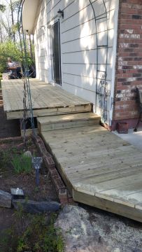Brown pressure treated multi level a deck with wooden railing, full width stairs to second ground based deck and stairs down the other side to brick.