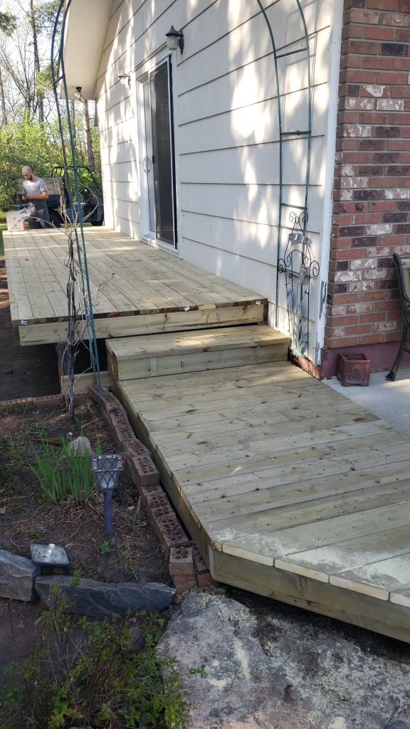 Brown pressure treated wrap around deck with wooden railing and multi-platform stairs