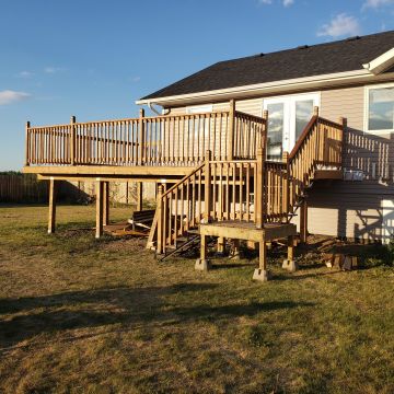 Brown pressure treated wrap around deck with wooden railing and multi-platform stairs