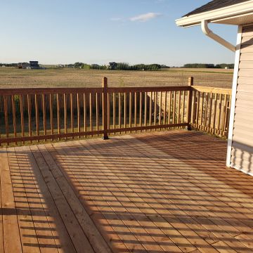This deck is about 12 years old in need of refreshing, first we took down all railings to prep for sanding, sanded down all boards including stairs, then we put on a premium stain with a life expectancy of up to 15 years.