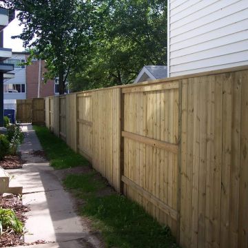 This is after building a new green pressure treated lumber standard 6 foot good neighbor style fence with 8 foot sections.